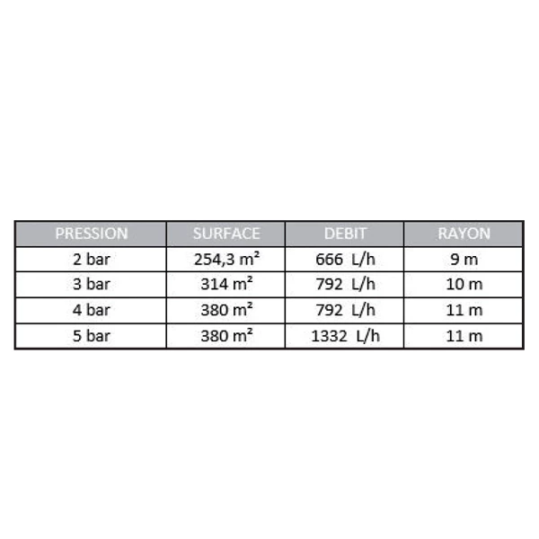 | 3 bar | 314 m² | 792 L/h | 10 m |