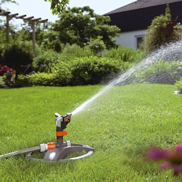 Arroseur canon sur traîneau prêt à l’emploi équipé d’un raccord d’arrosage Gardena et d’un capuchon.