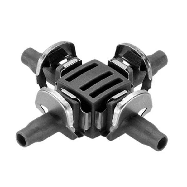Ce raccord de dérivation en croix est un élément du système d’arrosage goutte à goutte « Micro-Drip » Gardena.